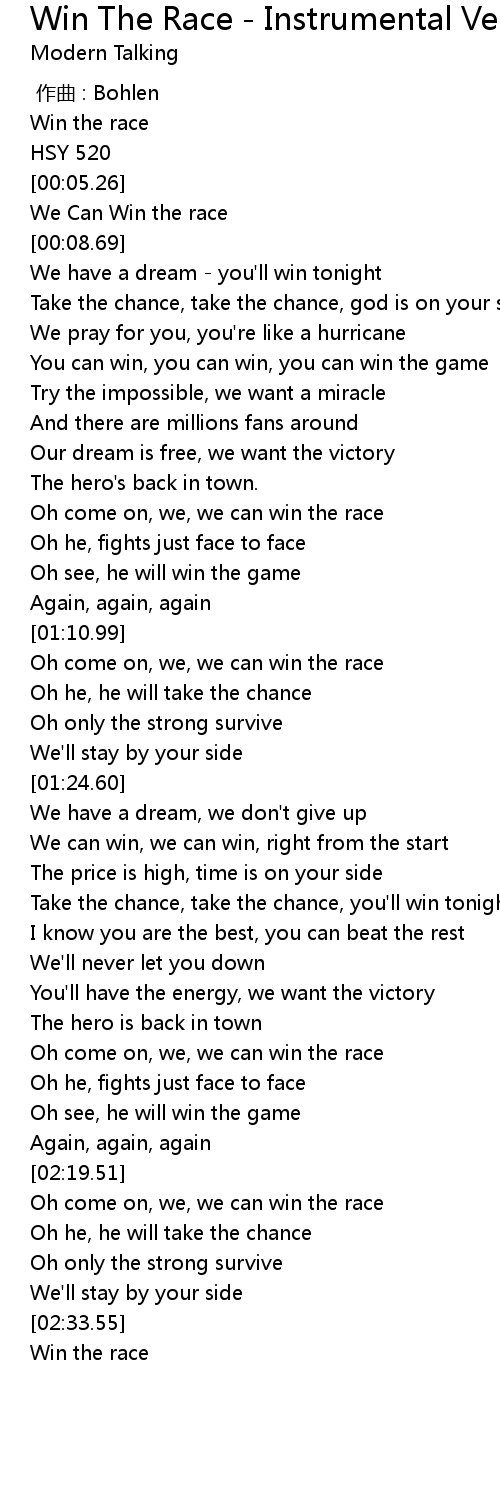 | [01:48.06] | Take the chance, take the chance, you' ll win tonight |