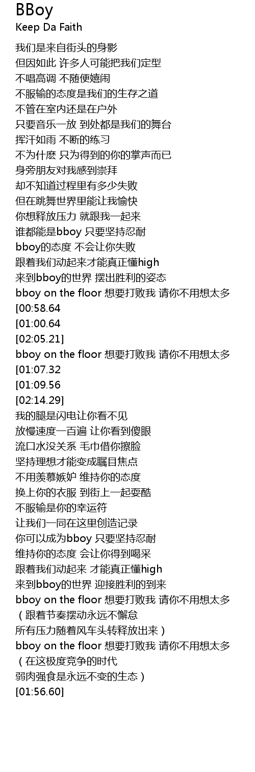 | [00:51.57] | 来到bboy的世界 摆出胜利的姿态 |