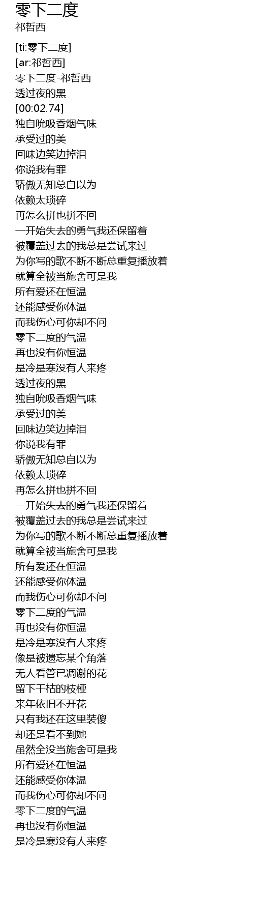 | [02:18.359] | líng xià èr dù de qì wēn |