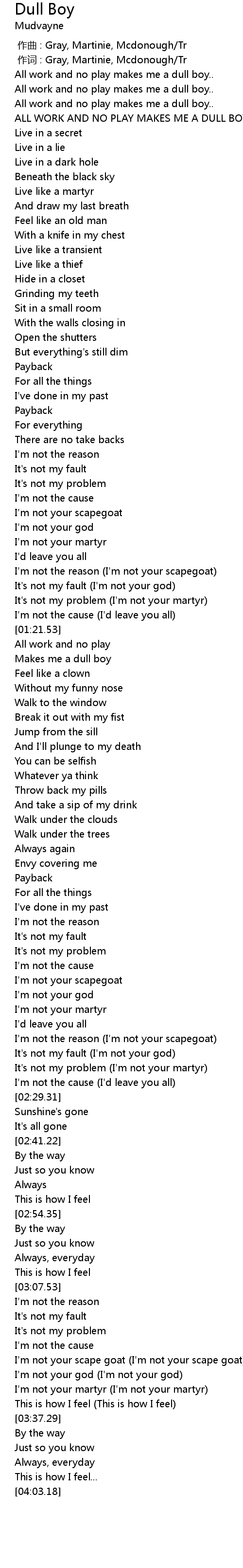 | [01:29.18] | Makes me a dull boy |