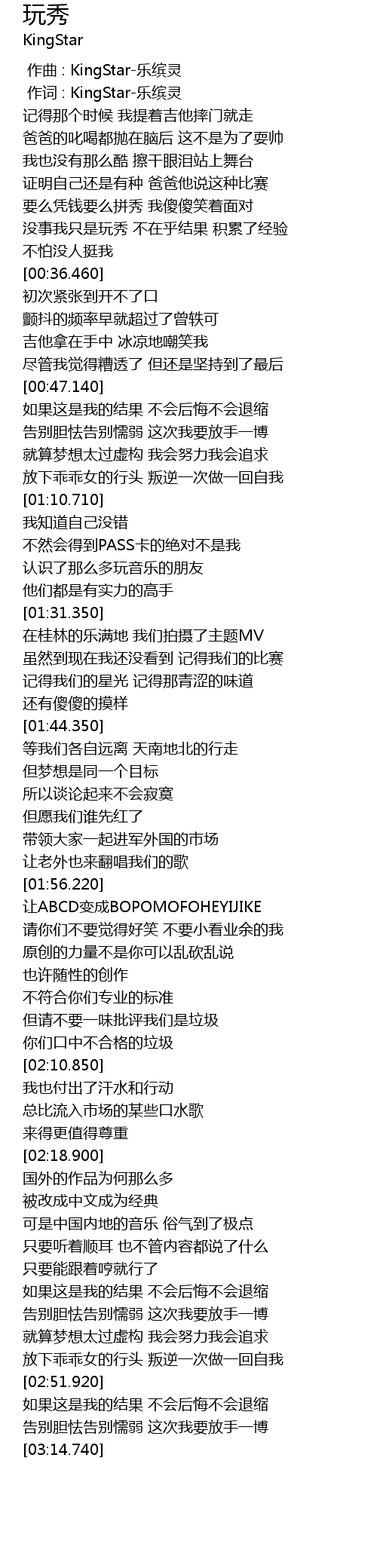 | [00:01.00] | 作词 : KingStar-乐缤灵 |