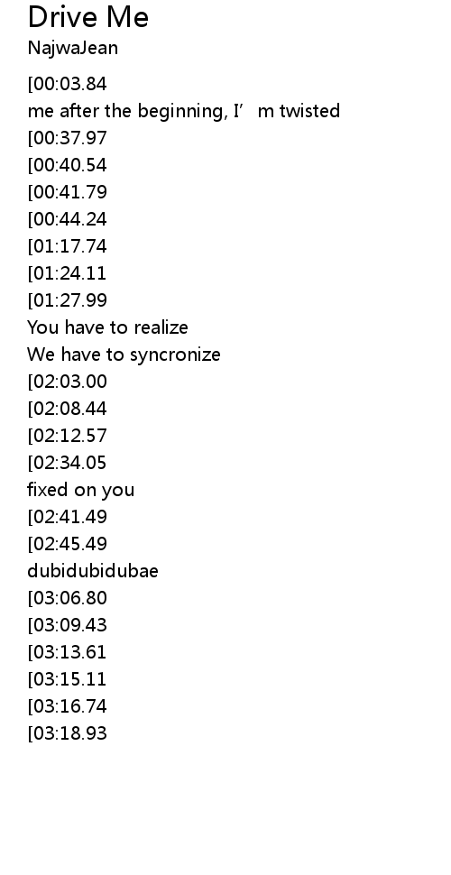 | [00:00.00][00:03.84][00:07.78][00:11.71][00:15.71][00:19.46][00:23.28][00:27.21][01:37.43][01:44.48] | Twist me after the beginning, I’m twisted |