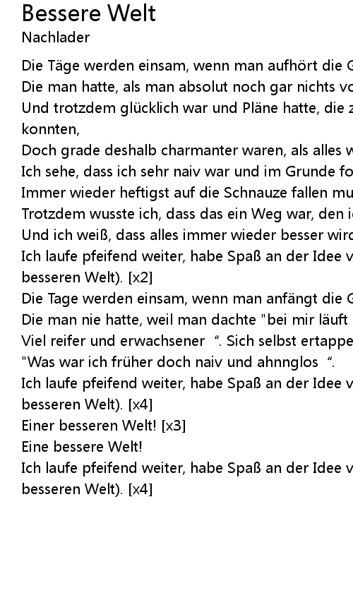 | Ich laufe pfeifend weiter, habe Spa an der Idee von einer besseren Welt einer besseren Welt. x2 | |