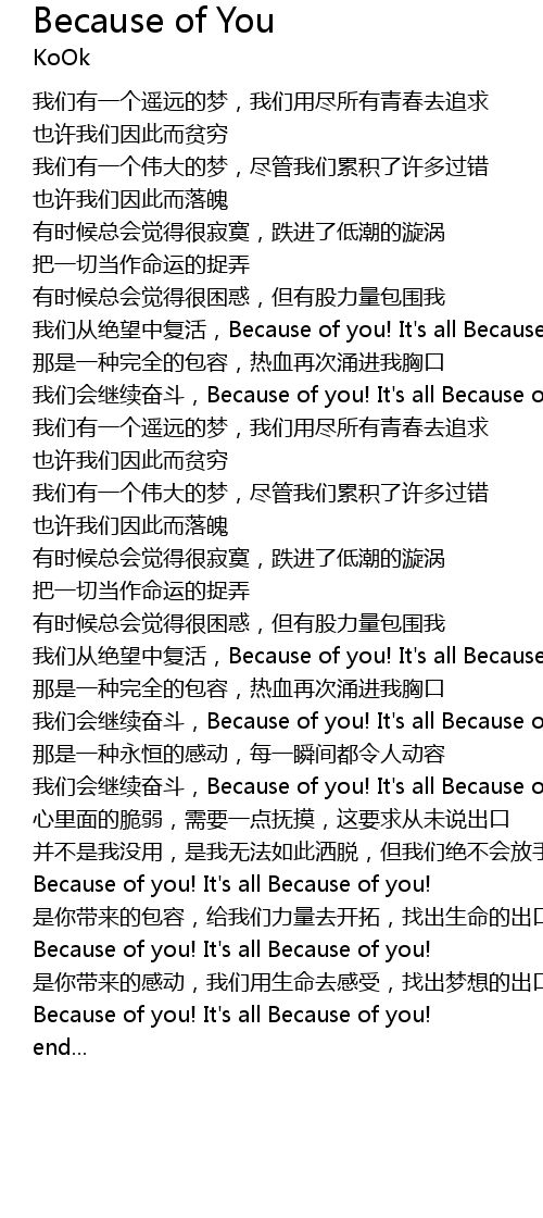 | [03:12.23] | 我们会继续奋斗,Because of you! It's all Because of you! |