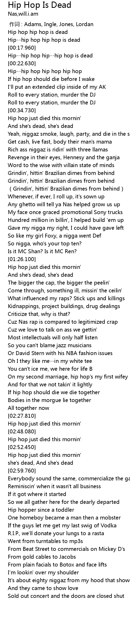 | [00:19.010] | Hip--hip hop hip--hip hop is dead |