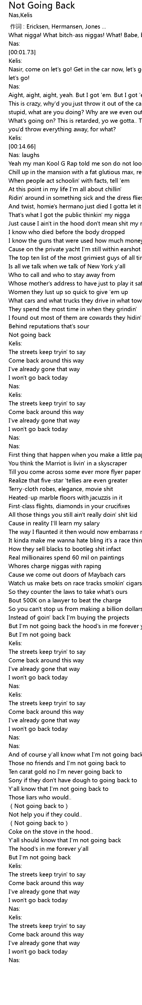 | [01:41.11]Nas:] | I' m not goin' back |