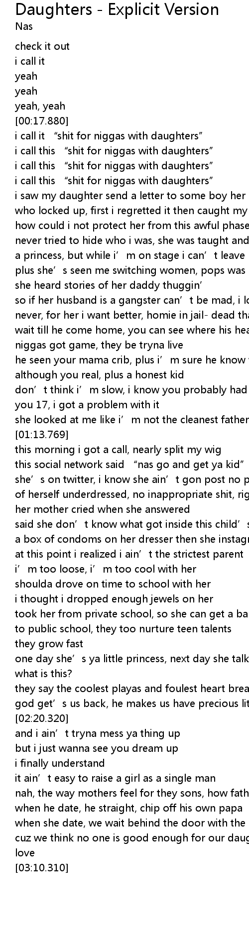 | [00:18.450] | i call it “shit for niggas with daughters” |