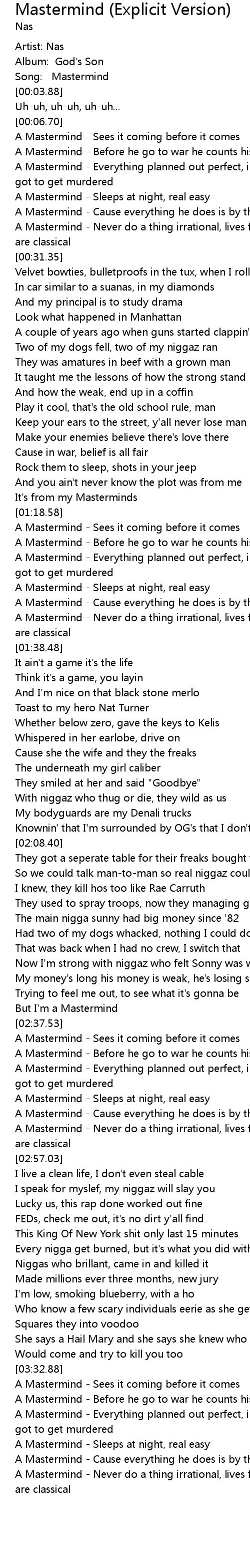 | [03:39.24] | A Mastermind - Everything planned out perfect, in case y'all niggaz got to get murdered |