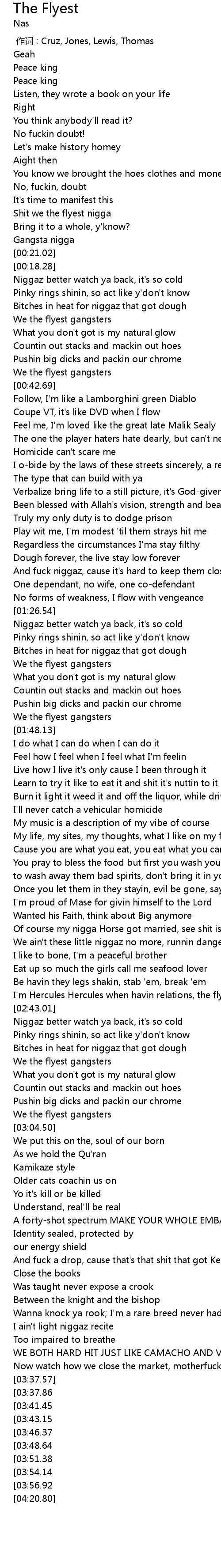 | [00:56.49] | I obide by the laws of these streets sincerely, a real nigga |