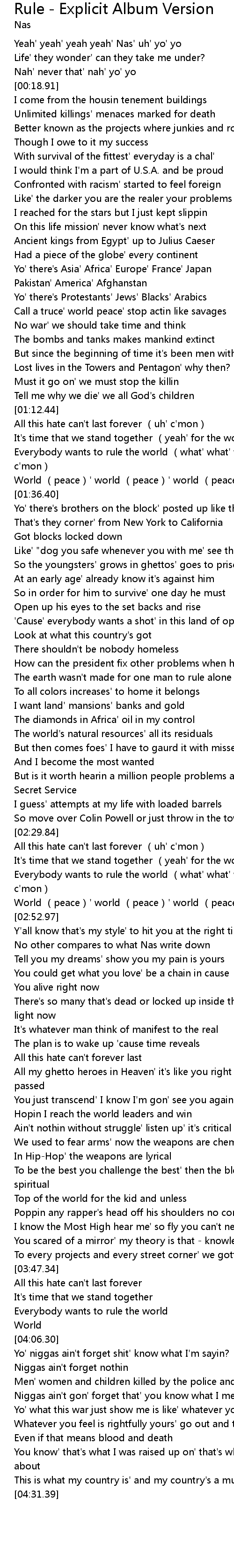 | [00:01.99] | Yeah' yeah' yeah yeah' Nas' uh' yo' yo |