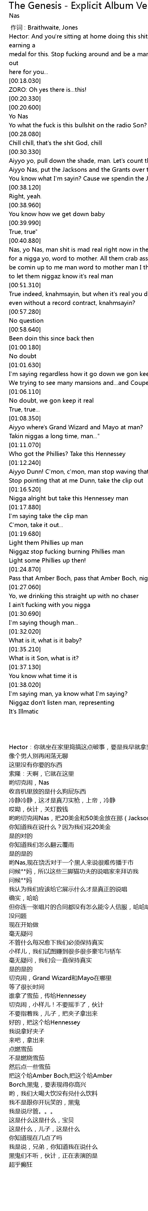 | [00:41.290] | Nas, yo Nas, man shit is mad real right now in the Projects |