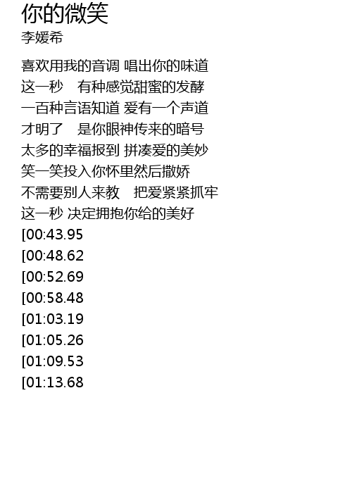 | [01:43.32][00:52.69] | 因为你 世界不再单调 我的微笑 |