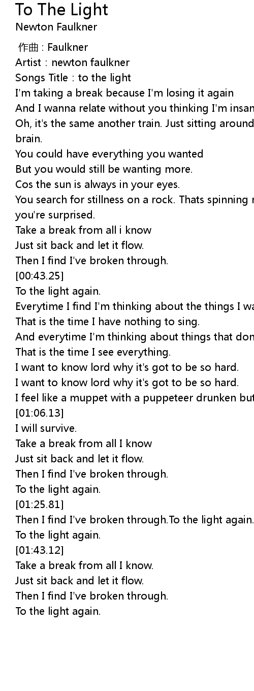 | [01:26.56] | Then I find I've broken through.To the light again.To the light again. To the light again. |