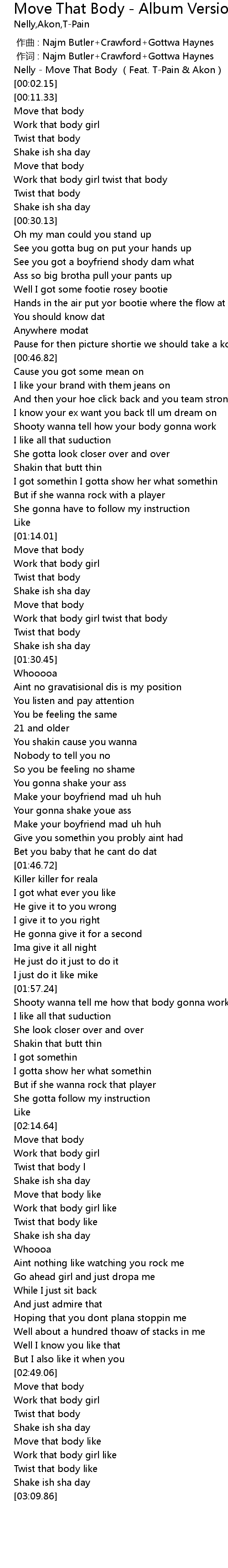 | [00:01.09] | Nelly - Move That Body (Feat. T-Pain & Akon) |