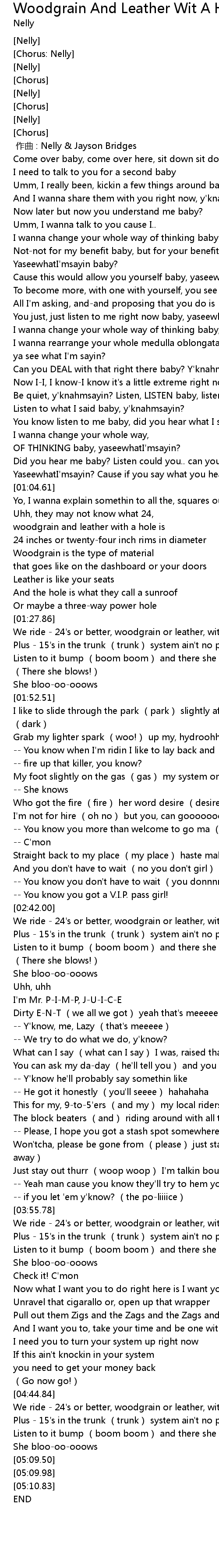 | [03:56.30] | We ride 24' s or better, woodgrain or leather, with a hole |
