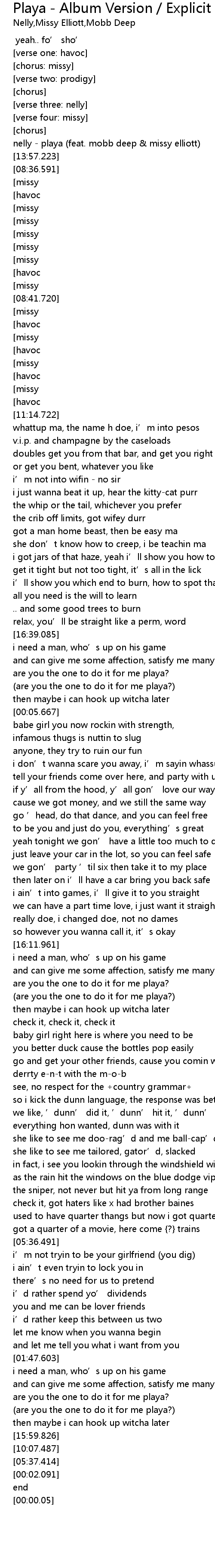 | [09:41.505] | nelly - playa (feat. mobb deep & missy elliott) |