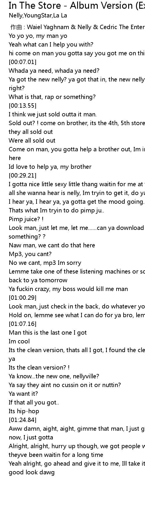 | [00:08.87] | Ya got the new nelly? ya got that in, the new nellyville, you got that right? |
