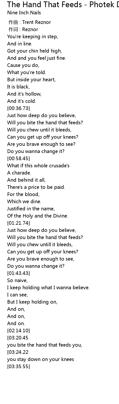 | [03:27.92][03:20.45][03:13.00][03:05.54][02:58.07][02:50.58][02:43.10][02:35.67] | Will you bite the hand that feeds you, |