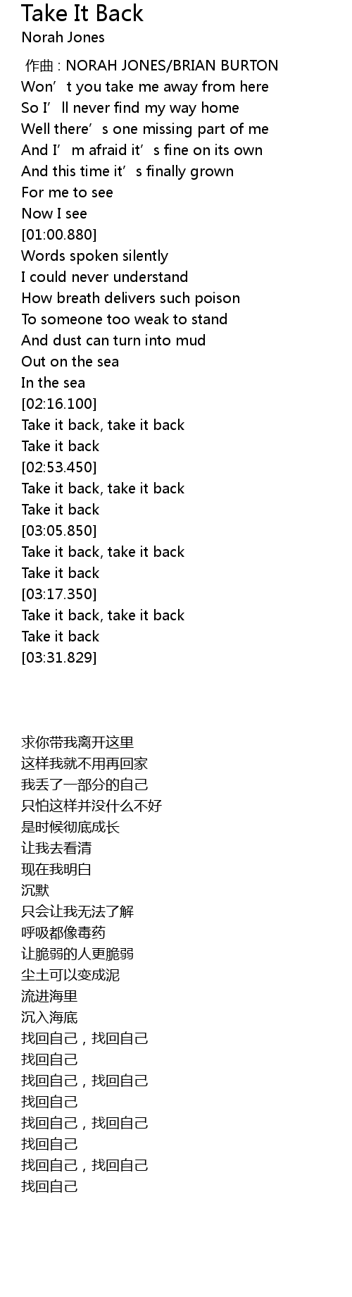 | [00:00.00] | 作曲 : NORAH JONES/BRIAN BURTON |