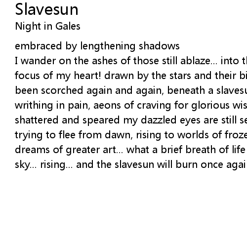 I wander on the ashes of those still ablaze... into the night and onward to the focus of my heart! drawn by the stars and their bidden delights my wings have been scorched again and again, beneath a slavesun moonlit dreams are nothing but writhing in pain, aeons of craving for glorious wisdom cascade onto me as if shattered and speared my dazzled eyes are still searching for a distant spark, trying to flee from dawn, rising to worlds of frozen silence... but slain are my dreams of greater art... what a brief breath of life in this grim and flaming sky... rising... and the slavesun will burn once again... |