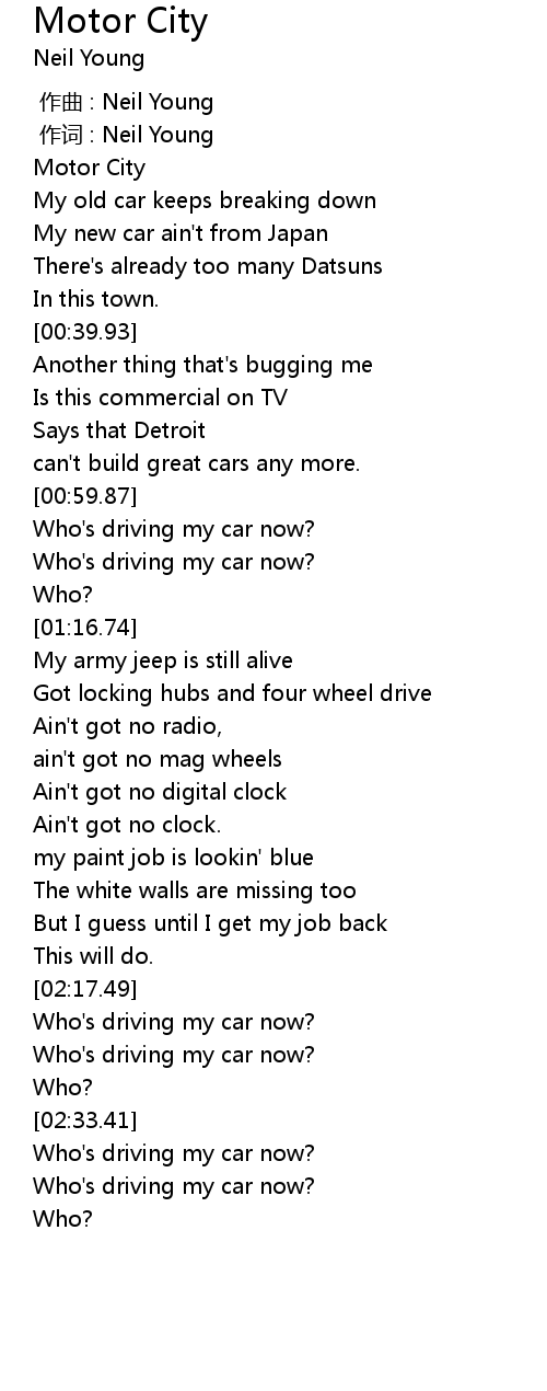 | [03:00.72] | Who' s driving my car now? |