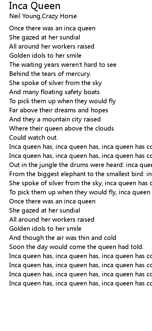 Inca queen has, inca queen has, inca queen has come. |