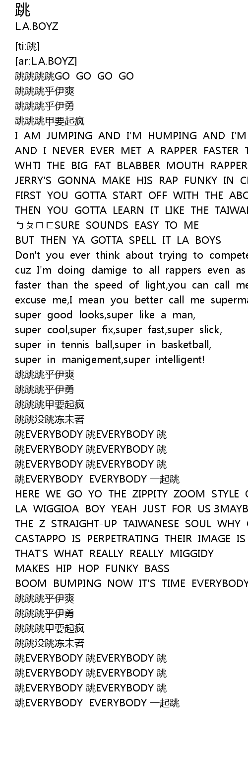 | [01:30.392] | tiào EVERYBODY tiào EVERYBODY tiào |