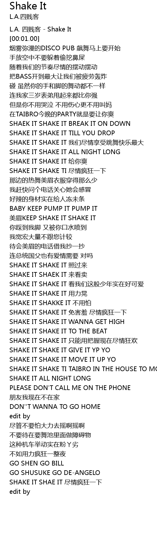 | [00:00.00] | L.A. 四贱客 - Shake It |