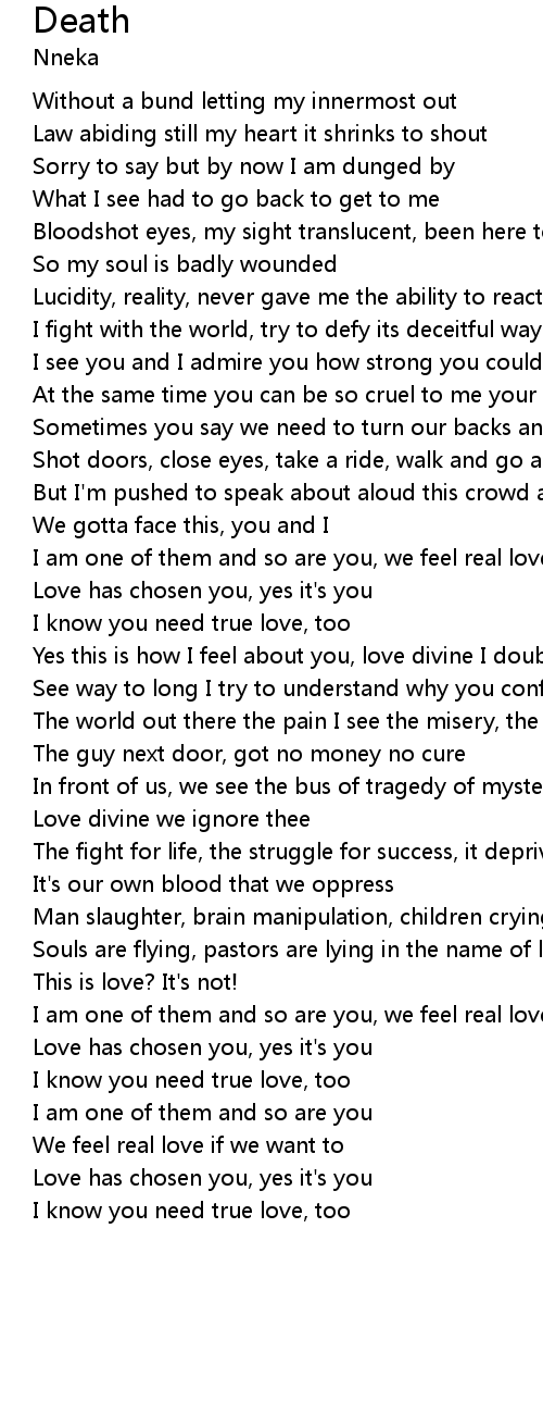| Bloodshot eyes, my sight translucent, been here too long | |