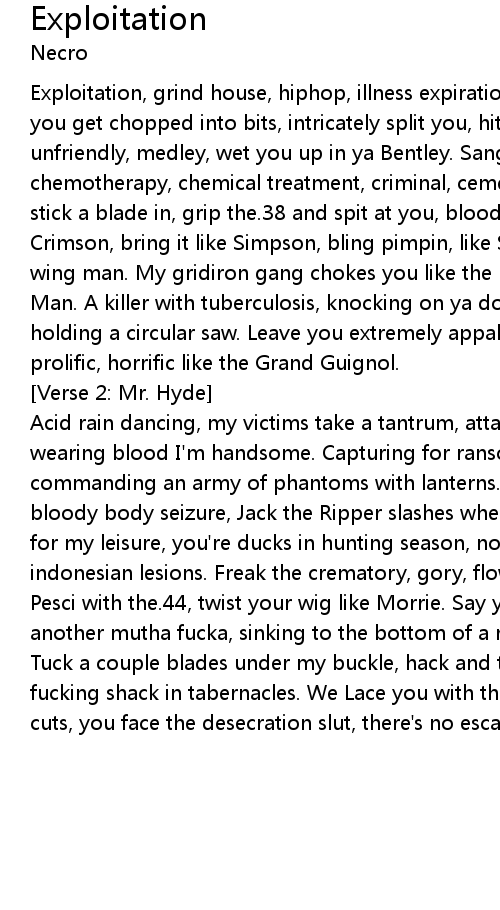 Exploitation, grind house, hiphop, illness expiration of ya life, the realness, you get chopped into bits, intricately split you, hit you like Jet Li, deadly, unfriendly, medley, wet you up in ya Bentley. Sanguinary, biochemistry, chemotherapy, chemical treatment, criminal, cemetery, symmetry. Intimidating, stick a blade in, grip the.38 and spit at you, blood precipitating. It's King Crimson, bring it like Simpson, bling pimpin, like Sing Sing pen, fly like a wing man. My gridiron gang chokes you like the hangman, 21st Century Schizoid Man. A killer with tuberculosis, knocking on ya door, built like Hercules holding a circular saw. Leave you extremely appalled, make you scream and crawl, prolific, horrific like the Grand Guignol.