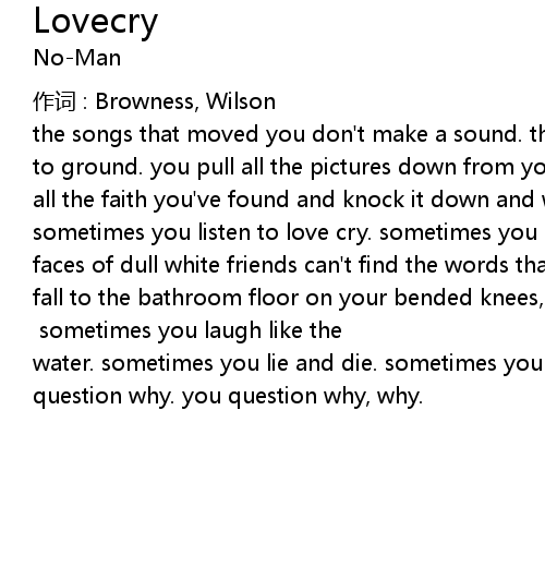 | the songs that moved you don' t make a sound. the light that saved you now gone to ground. you pull all the pictures down from your crumbling walls. you take all the faith you' ve found and knock it down and watch it crawl. chorus: sometimes you listen to love cry. sometimes you question why. the dull white faces of dull white friends can' t find the words that will heal or mend. you fall to the bathroom floor on your bended knees, your fist hits against the door you' re staring at the way it bleeds. chorus sometimes you laugh like the water. sometimes you lie and die. sometimes you question why. sometimes you question why. you question why, why. |