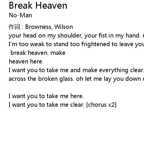 | I' m too weak to stand too frightened to leave you, too frightened to breathe. too frightened to question, to question belief. chorus: break heaven. make heaven here. | |