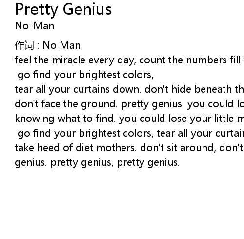 | feel the miracle every day, count the numbers fill the cup. every move in every way. every move is built on blood. chorus 1: go find your brightest colors, tear all your curtains down. don' t hide beneath the covers. don' t sit around, don' t face the ground. pretty genius. you could lose your little mind never knowing what to find. you could lose your little mind staring blind into the light. chorus 2: go find your brightest colors, tear all your curtains down. take heed of diet mothers. don' t sit around, don' t face the ground pretty genius. pretty genius, pretty genius. |