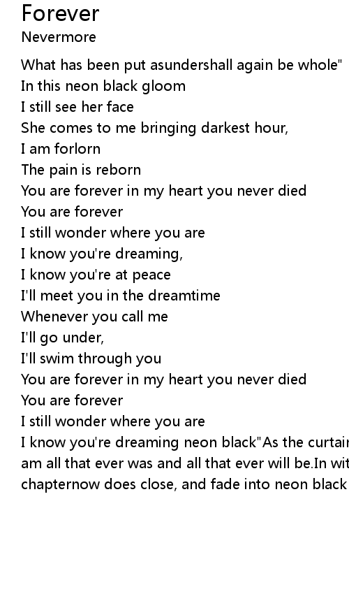 I know you're dreaming neon black"As the curtain calls, and the cast recedes,I am all that ever was and all that ever will be.In wither and repose this frayed chapternow does close, and fade into neon black |