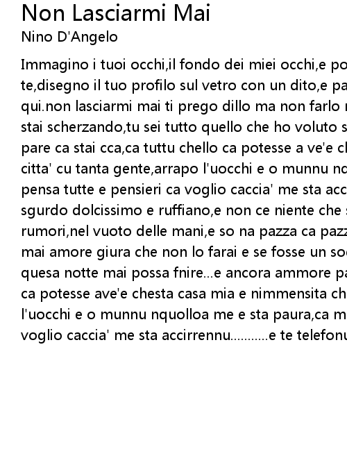Immagino i tuoi occhi,il fondo dei miei occhi,e poi respiro piano e vedo te,disegno il tuo profilo sul vetro con un dito,e parlo ate come se fossi qui.non lasciarmi mai ti prego dillo ma non farlo mai,e se fosse vero di che stai scherzando,tu sei tutto quello che ho voluto sempre,e chiuru l'uocchi e pare ca stai cca,ca tuttu chello ca potesse a ve'e chesta casa mia pare na citta' cu tanta gente,arrapo l'uocchi e o munnu nquollo a mee sta paura ca me fa pensa tutte e pensieri ca voglio caccia' me sta accirrennu..immaggino il tuo sgurdo dolcissimo e ruffiano,e non ce niente che somiglia a te..ti sento nei rumori,nel vuoto delle mani,e so na pazza ca pazzisce e te......non lasciarmi mai amore giura che non lo farai e se fosse un sogno lasciami dormire,fa che quesa notte mai possa fnire...e ancora ammore pare ca stai cca,cu tuttu chello ca potesse ave'e chesta casa mia e nimmensita che cresce sempre,e arrapo l'uocchi e o munnu nquolloa me e sta paura,ca me fa' penza tutte e penziere ca voglio caccia' me sta accirrennu...........e te telefonu pe no muri....... |