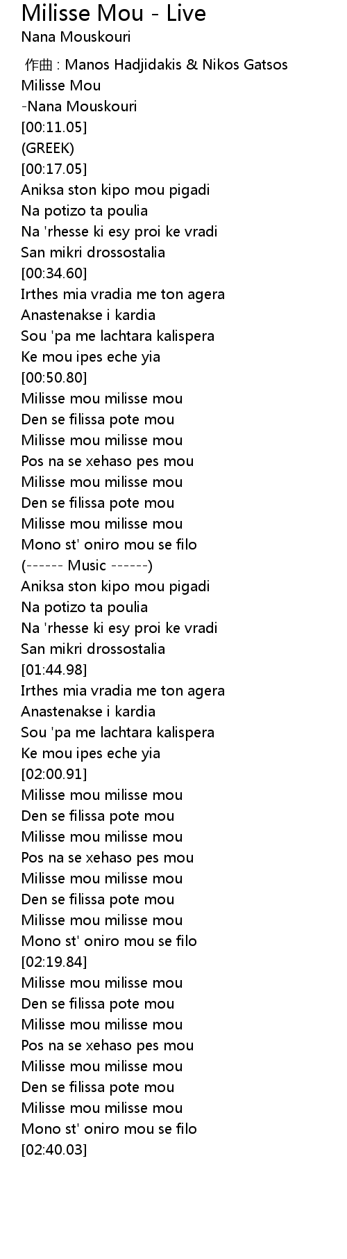 | [01:00.30] | Milisse mou milisse mou |
