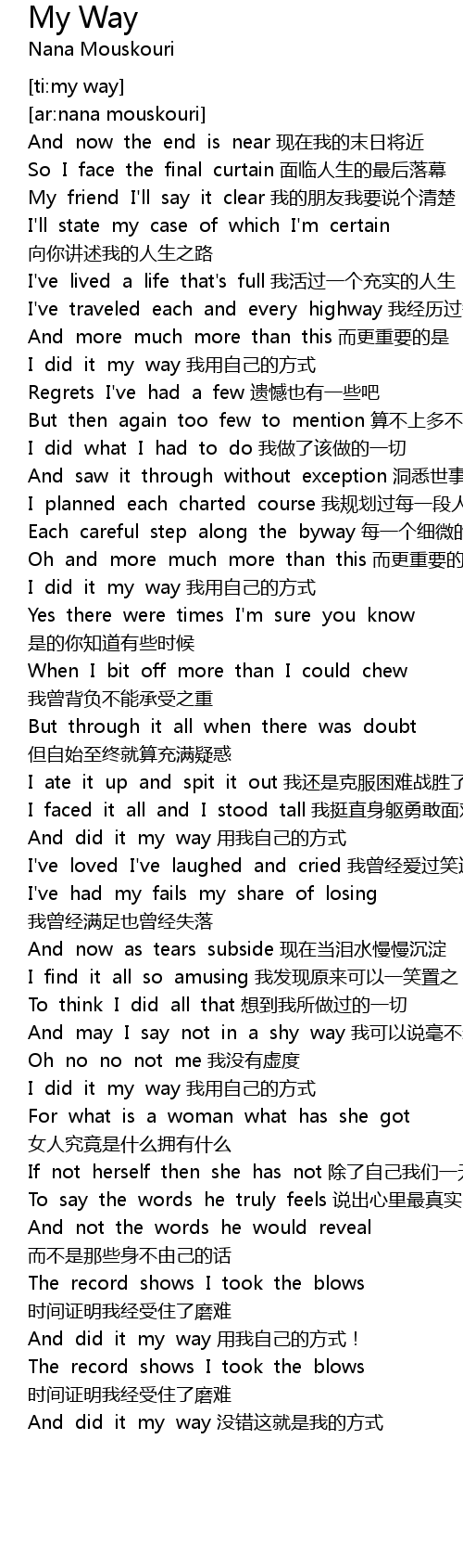 | [00:46.337] | I did it my way wǒ yòng zì jǐ de fāng shì |