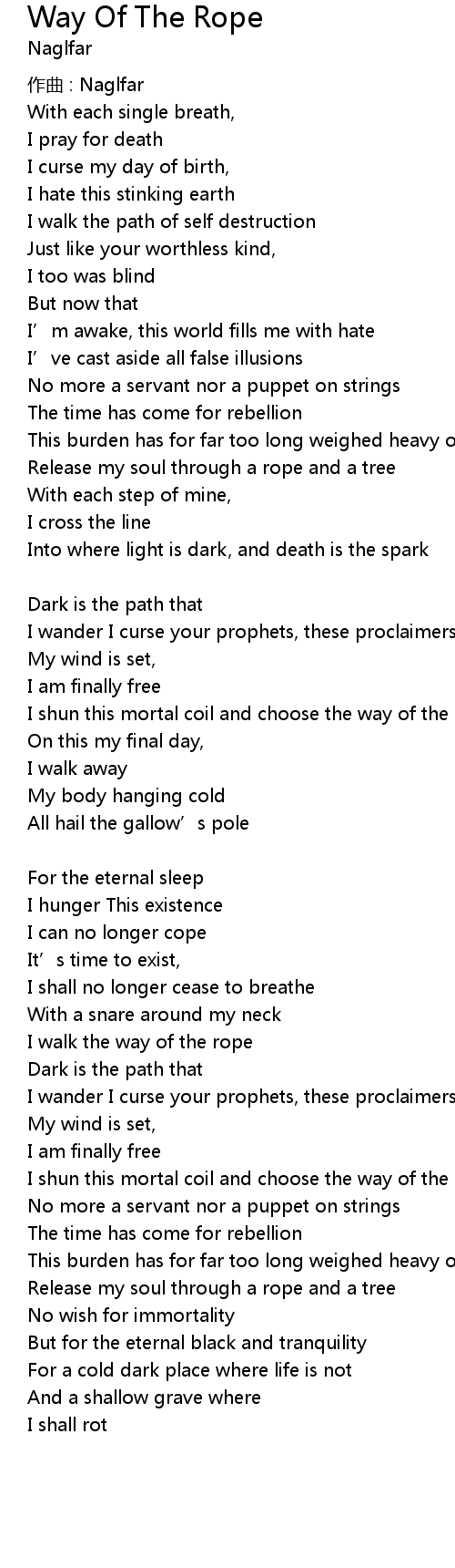 | I shun this mortal coil and choose the way of the rope | |