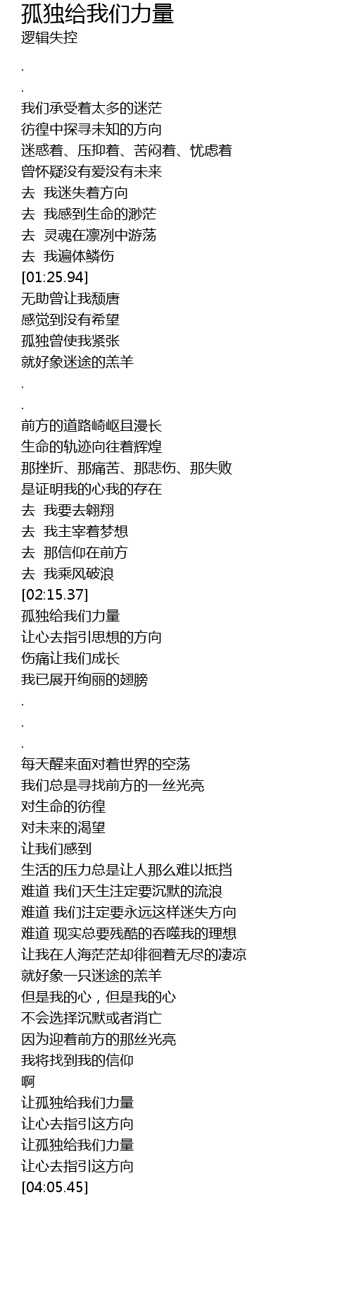 | [02:16.76] | gū dú gěi wǒ men lì liàng |