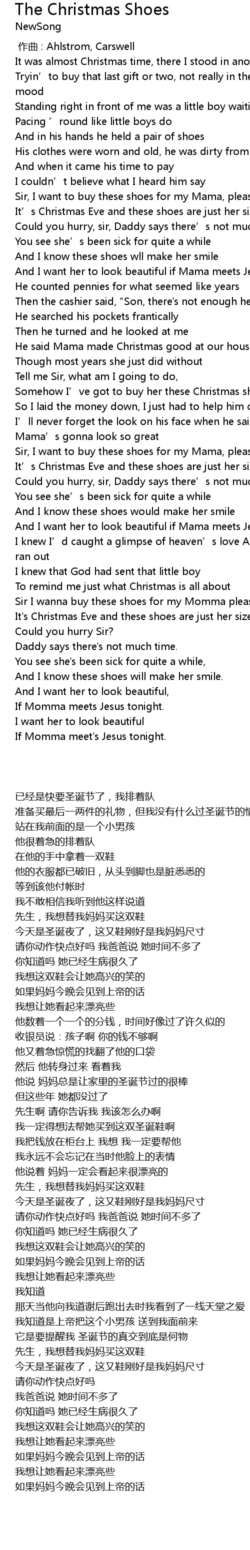 | [02:12.600] | Somehow I’ve got to buy her these Christmas shoes |