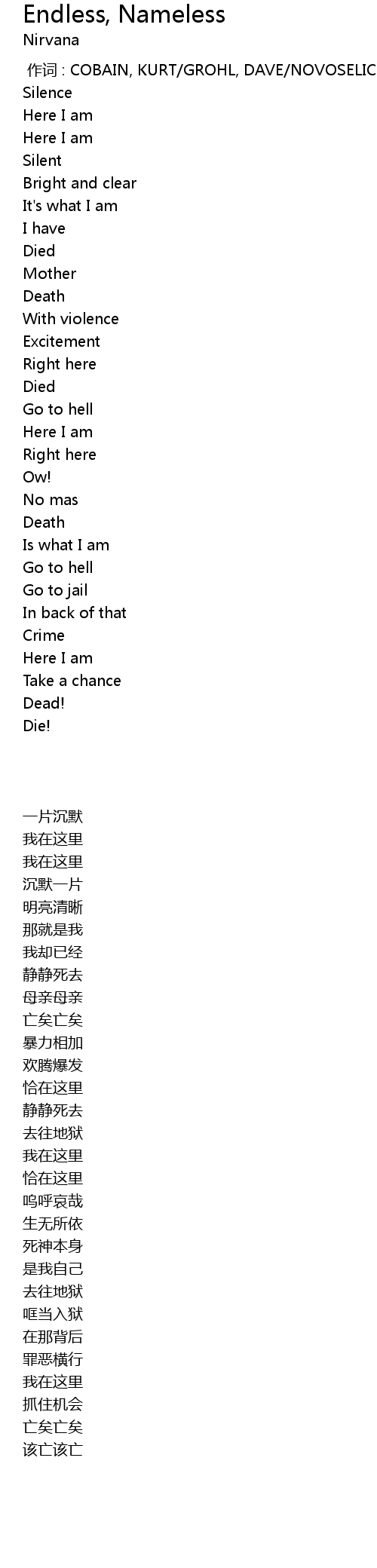 | [00:00.00] | 作词 : COBAIN, KURT/GROHL, DAVE/NOVOSELIC, KRIST |