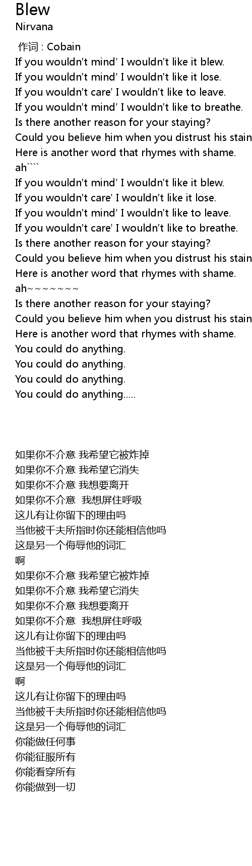 | [00:59.15] | If you wouldn t mind' I wouldn t like it blew. |