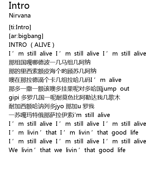 | [00:09.511] | ō zài nà lā dé dī gè kǎ jǐ zǔ lā hā jǐ mǎ I ' m alive |