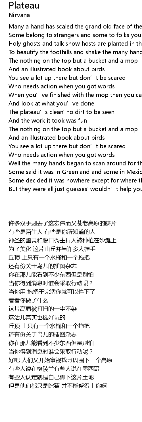 | [01:14.100] | The plateau' s clean' no dirt to be seen |