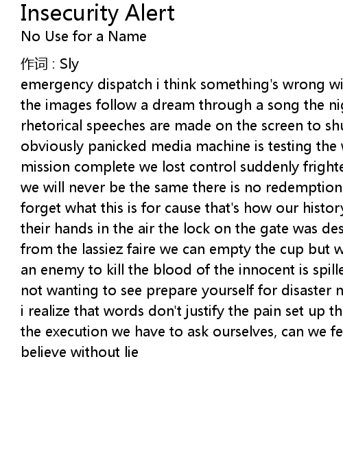 | emergency dispatch i think something' s wrong with words its so hard to construe the images follow a dream through a song the nightmare has finally come true rhetorical speeches are made on the screen to shut us up and rest assure an obviously panicked media machine is testing the will of a country so unsure mission complete we lost control suddenly frightened by it all to put it simply we will never be the same there is no redemption in this war so please don' t forget what this is for cause that' s how our history is made security cop with their hands in the air the lock on the gate was destroyed now everyone rises from the lassiez faire we can empty the cup but we cannot fill the void without an enemy to kill the blood of the innocent is spilled to put it lightly we are not wanting to see prepare yourself for disaster now so few are sane here anyhow i realize that words don' t justify the pain set up the guillotine and televise the execution we have to ask ourselves, can we feel safe? you can' t spell believe without lie |