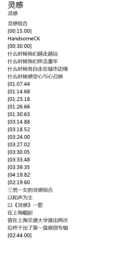 | [03:46.07][03:14.88][01:36.98] | deng dai ling gan chu xian |