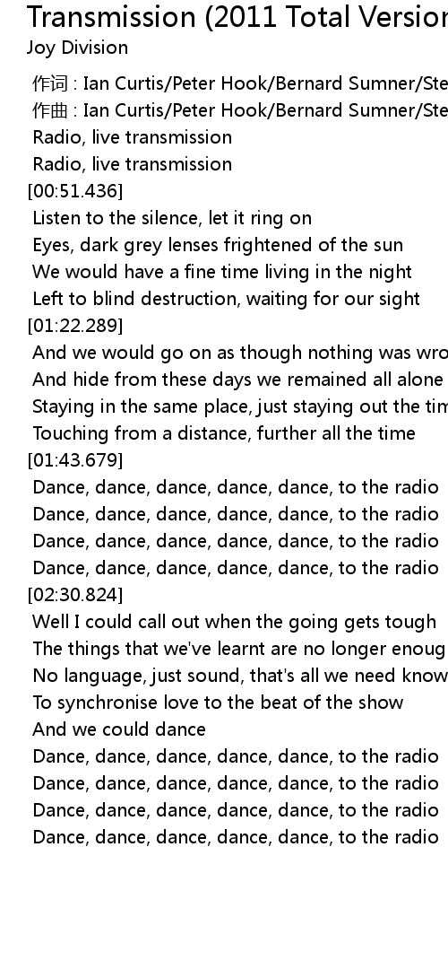 | [00:01.000] | zuò qǔ : Ian Curtis Peter Hook Bernard Sumner Stephen Morris |
