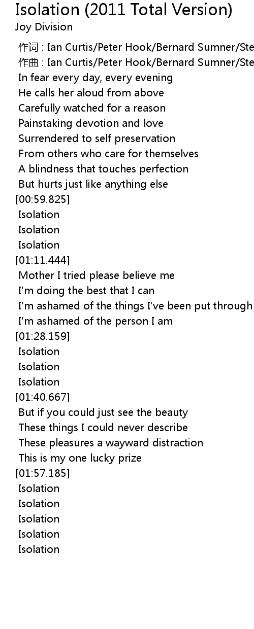 | [00:01.000] | zuò qǔ : Ian Curtis Peter Hook Bernard Sumner Stephen Morris |