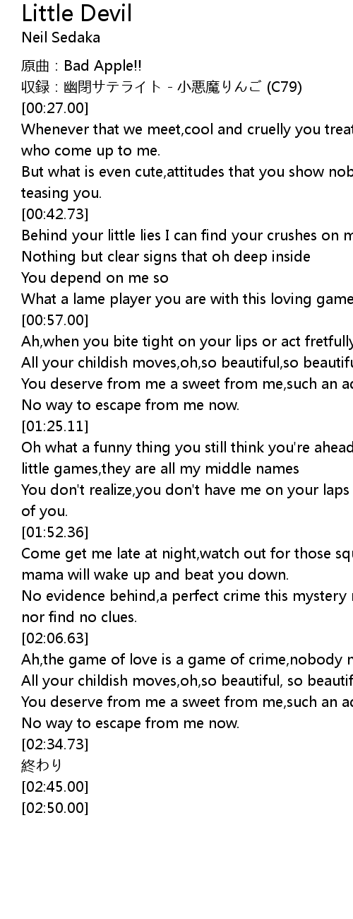 | [00:22.50] | 収録:幽閉サテライト - 小悪魔りんご (C79) |