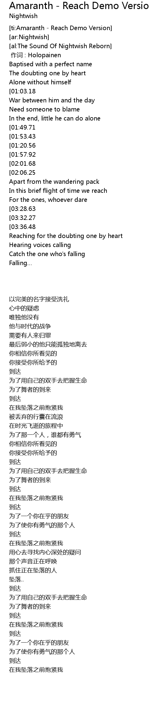 | [01:12.47][01:20.56][01:57.33][02:05.51][02:12.26][02:20.29][03:12.33][03:20.68][03:27.60][03:35.53] | Reach |